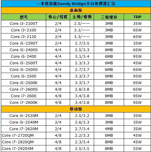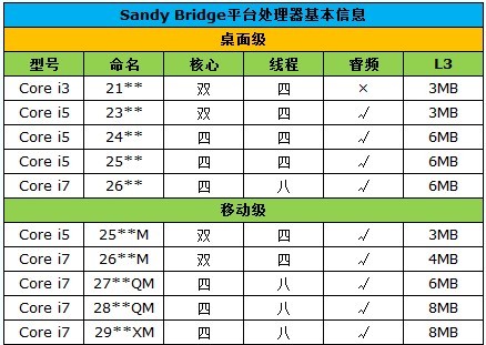 Sandy Bridge¼ÒÊôÈÔÈ»ÑØÓÿáî£i3/i5/i7µÄÆ·ÅÆ+×ÓϵÁеÄÃüÃû·½Ê½£¬±àºÅÉϲÉÓÃËÄλÊý×Ö£¬´ËÖеÚһλ¾ùΪ¡°2¡±£¬±íʾµÚ¶þ´úCore iϵÁУ¬±àºÅÄ©¶ËÿÿÓÐÒ»¸ö´ú±í²»Í¬º¬ÒåµÄ×Öĸ£ºK´ú±í²»Ëø¶¨±¶Æµ£¬¾ùΪ¸ß¶Ë²úÆ·£»S´ú±íÐÔÄÜÓÅ»¯£¬ÔʼƵÂʱÈûÓÐ×Öĸºó׺µÄµÍºÜ¶à£¬µ«Êǵ¥ºËÐļÓËÙ×î¸ßƵÂʸù±¾Ïàͬ£¬ÁíÍâÈȼƻ®¹¦ºÄ¶¼ÊÇ65W£»T´ú±í¹¦ºÄÓÅ»¯£¬Èȼƻ®¹¦ºÄÖ»ÓÐ45W»ò35W£¬µ«ÊÇÆµÂÊÒ²ÊǸ÷²úÆ·ÖÐ×îµÍµÄ¡£ ÏÖÔÚ¾àÀëSandy Bridgeƽ̨·¢²¼»¹ÓÐÒ»¸öÐÇÆÚµÄʱ¼ä£¬ÔÛÃDz»·Áͨ¹ýÕâÑùһƪÎÄÕÂÀ´¶ÔSandy Bridgeƽ̨µÄÌØµã¡¢±ä»¯µÈÏà¹ØÐÅÏ¢×öÒ»¸öÔ¤ÈÈ¡£ ÏÂÃæÔÛÃÇͨ¹ý±í¸ñÀ´Á˽âÒ»ÏÂÆäÏà¹ØÐÅÏ¢£º