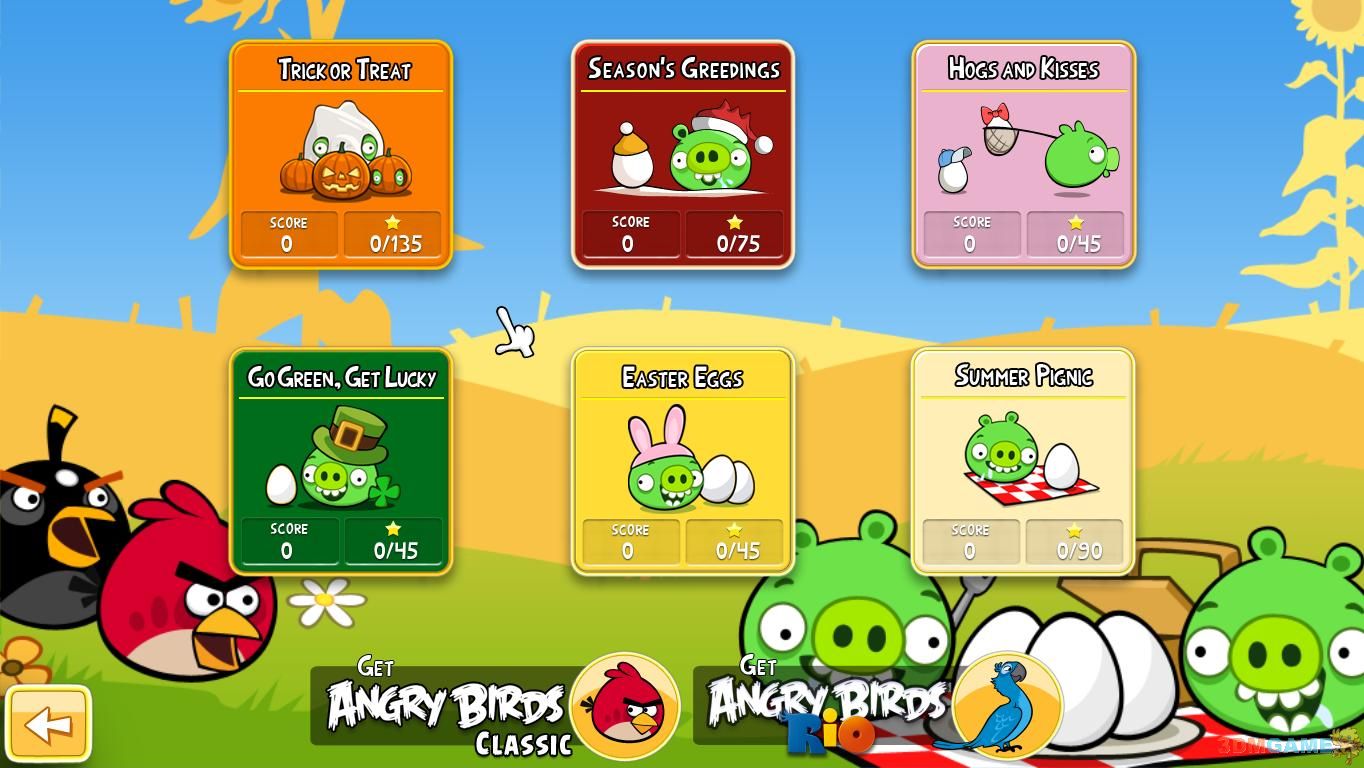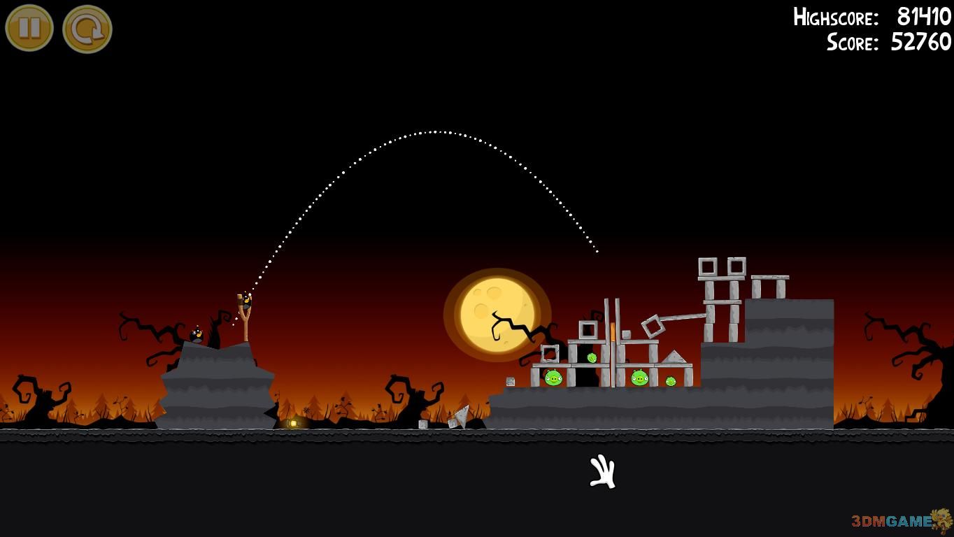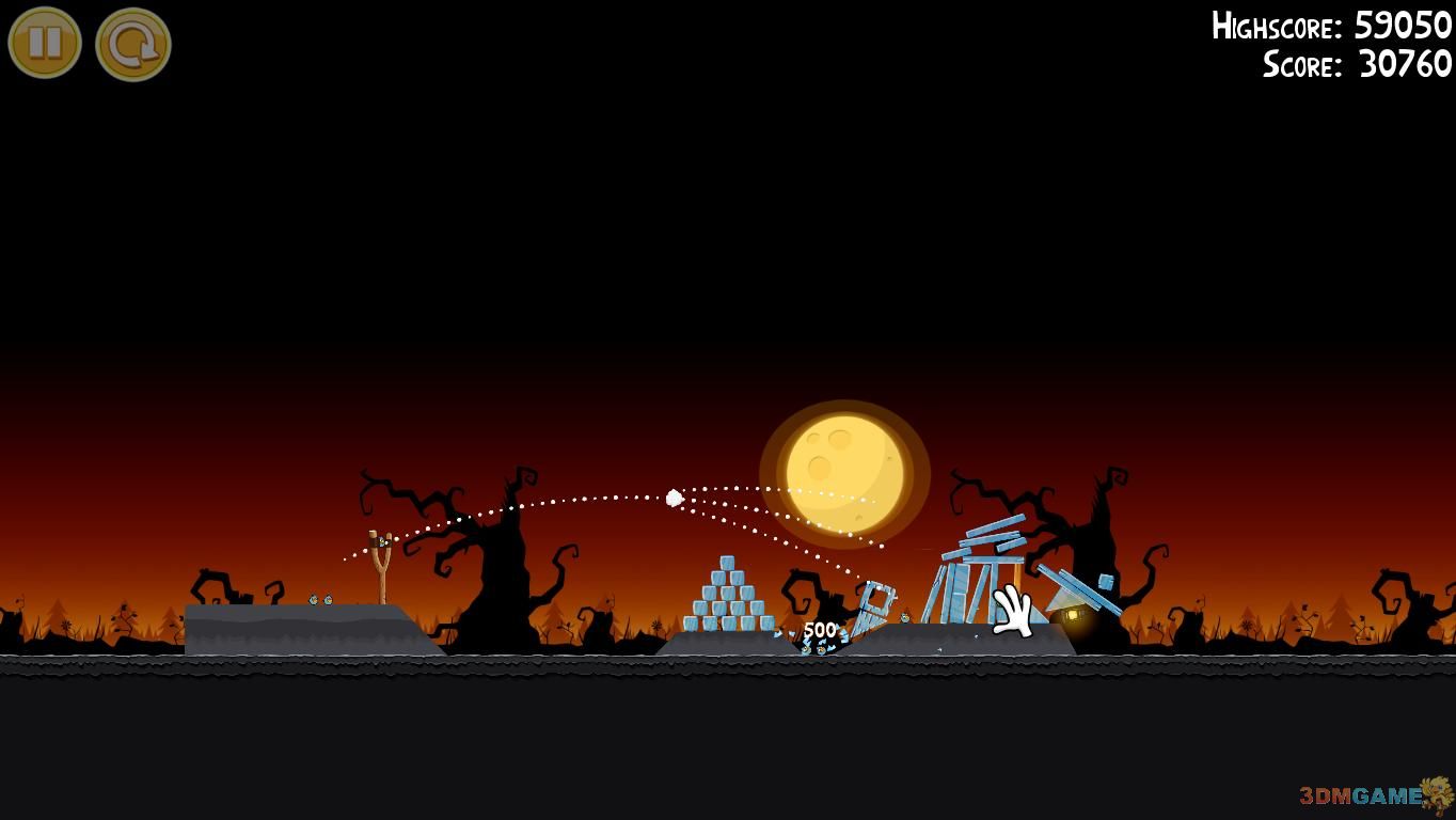1-3:这一关开始有难度了,大概在玻璃堆前的树桩位置炸开小鸟,即可一鸟消灭所有小猪,并砸碎一定数量的玻璃方块!