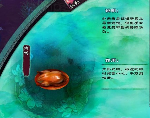 在仙剑奇侠传5中他关时会看到有很多烤鸭,看上去很可口,但不一直不太清楚这烤鸭有什么用处?到底应该怎么样处理,通过尝试之后终于了现了烤鸭的经典之处,鸭吃了后有几率加满血和发动10倍攻击,我用云凡打出过2个1W+伤害。也可能被噎死(即死效果)