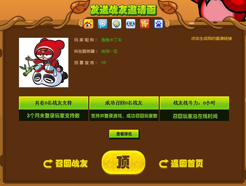 如果你是被召唤的战友|,点击朋友送给你的链接后|,你将会进入他的活动主页上。此时你只需点击页面下方的顶|,即可为你的朋友加分|。如果他是你的好哥们,那你一定要立刻登陆游戏并找到他|,和他尽情享受比赛的乐趣!如果你的在线时间足够长|,你们都将有机会获得精彩的奖品哦!注意:活动信息将在第二天进行更新。